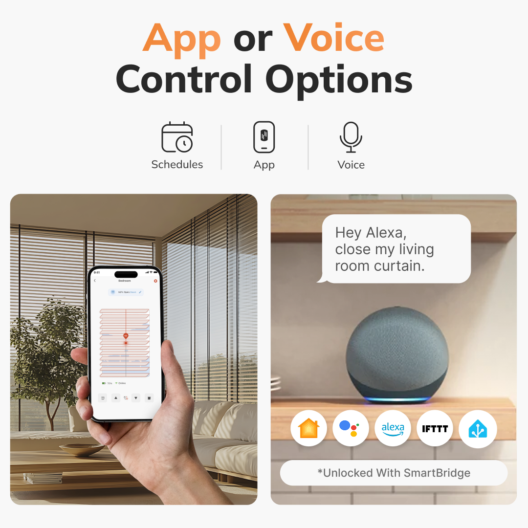• SMART CONTROL YOUR WAY – Control your blinds using the RYSE app, set automated schedules, or use voice commands with Alexa, Google Home, and Apple HomeKit (via SmartBridge). Adjust your blinds anytime for the perfect lighting and privacy.