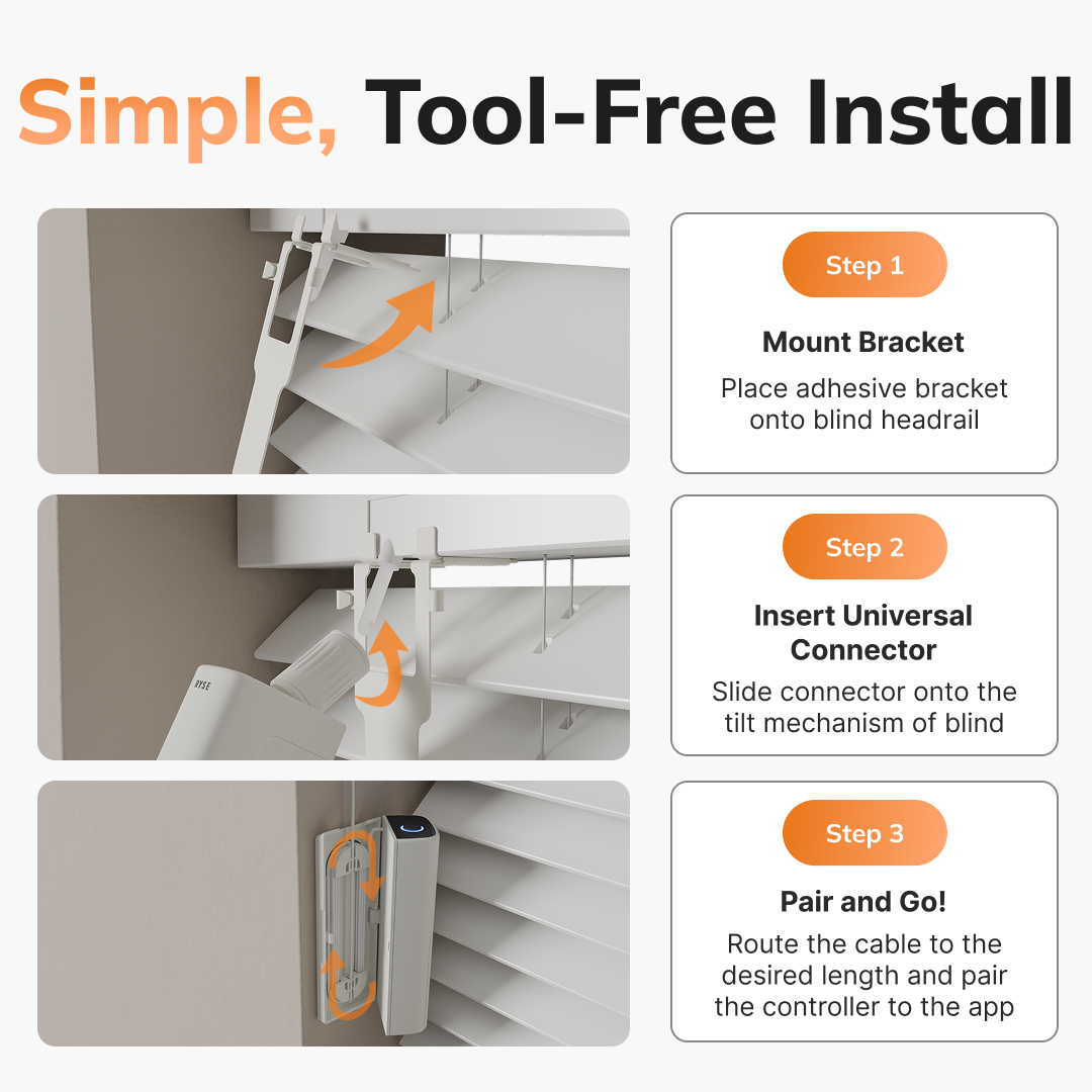 The RYSE SmartBlind transforms your existing horizontal blinds with tilt wand into motorized smart blinds in minutes—no replacement required.